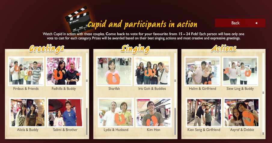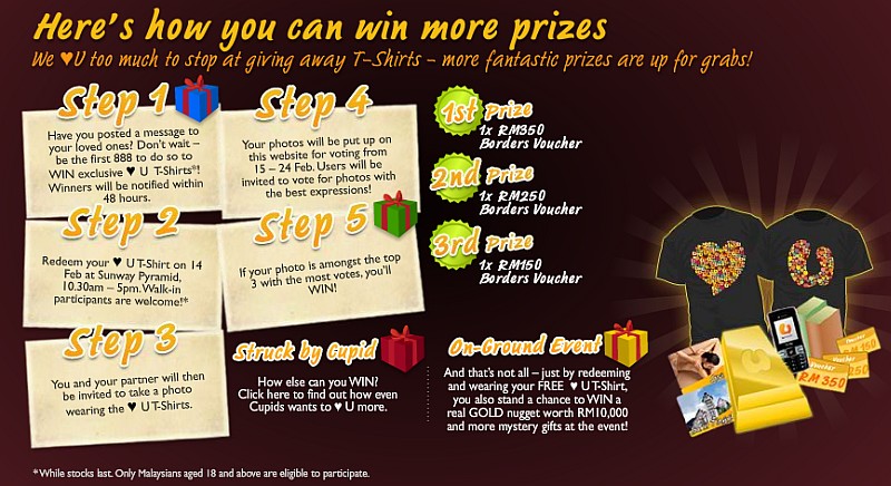 Firstly the site launches onto a heart shape dedication area and from the looks of it, the first 888 who post their dedications would be entitled to win exclusive designed U couple shirts. From the instruction, the 888 lucky winners would need to collect their couple shirts at Sunway Pyramid on 14th February itself. And that’s not all…