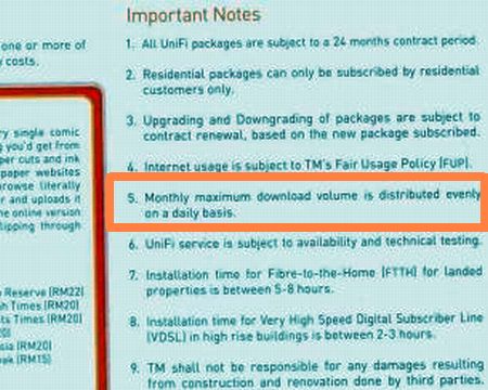 The way TM UniFi hide this important term on daily cap is totally irresponsible and done without class. Telcos should be transparent and up front with their terms & conditions especially when it affects their customers greatly. The least they could do is to make it clear up front that monthly usage is distributed by daily basis. Not all customers are as sharp as one of our readers and this would obviously trap unknowing customers in a unfair contract.