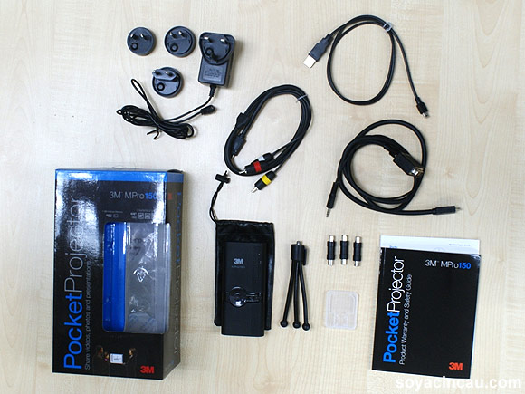 The kit that comes with the projector is pretty decent. You get two input cables for RCA and VGA, a USB data transfer cable, a charger with changeable heads to to allow you to juice up using the various power sockets of almost every continent on the planet, a carrying pouch and a mini tripod as well as a removable and rechargeable battery.