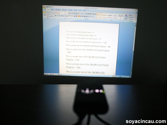 Set at about 2 meters away from the projection screen, clarity is affected slightly and in practical applications we can see that the MPro150 being used for presentations where no more than five people attending. Any more and the projected image is just too small for those in attendance to see any detail.
