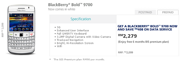 The Blackberry Bold 9700 White is also available on Hotlink: Maxis’s Prepaid.