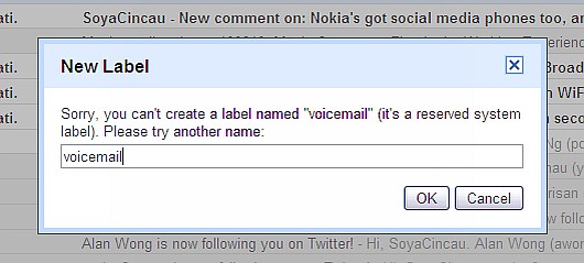 You’ll be greeted with an error massage “Sorry, you can’t create label named “voicemail” (it’s a reserved system label). Please try another name”.