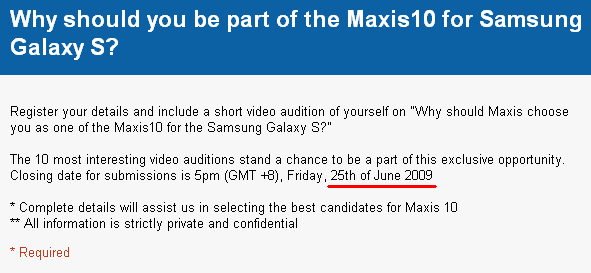 So if you’re interested to be amongst the 10 reviewers chosen, head on over the to the survey site to be in the running. Unlike the previous Maxis 10 Reviewer program, to be in the running for the Galaxy S, you’ll need to submit a video and tell Maxis why you deserve to review the Galaxy S. Also what would be useful — the ability to turn back time. Take a look at the picture above, the closing date was last year 25th of June 2009. You might need some help from @Doc__Brown with that.