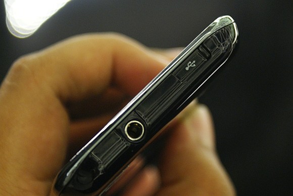 At the top of the Galaxy S you get a standard 3.5mm headphone jack and also a microUSB port that is covered with a slide cover. The slide cover for the microUSB port is a nice touch but we’re not too sure if it’ll still feel as solid after the 100th time you open it to charge the device. Also, we’d prefer the microUSB port to be at the bottom of the device rather than on the top. At the current location, we can imagine the charging cable getting in your way when using the phone while charging.