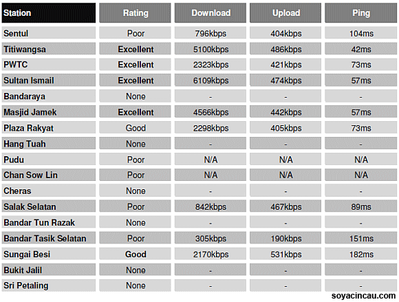 From the LRT test, only 9 out of 17 stations that we passed thru has good WiMAX coverage. Surprisingly the Sultan Ismail to Titiwangsa stretch gave us the best connection with speeds up to 6Mbps download but there were still disconnections in between.