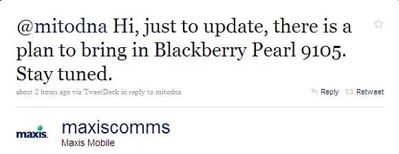 Some news for the Blackberry fans out there. Maxis mentioned via its official Twitter account that it has plans to bring the BlackBerry Pearl 9105.