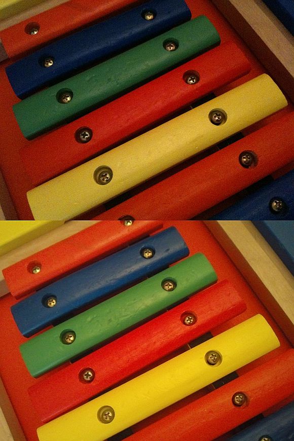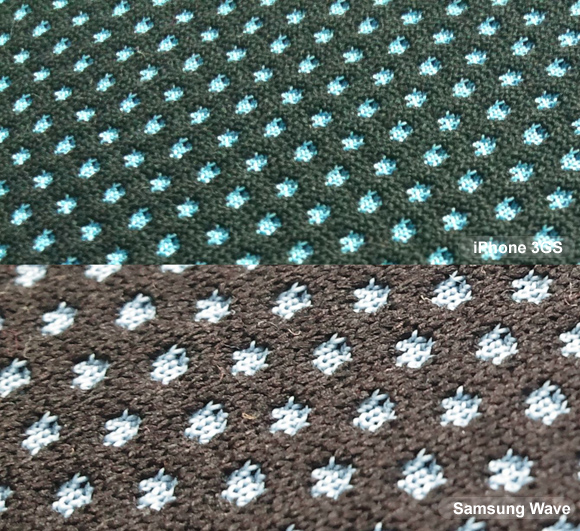 Macro test shot: iPhone 3GS (top) vs. Samsung Wave S8500 (bottom). Click for 100% crop