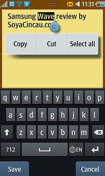 We do however like how cut and paste is executed on the Wave. Similar to the Android and iPhone method, you tap and hold to select a word but that’s where the similarity ends. On the Wave, the word select cursor is larger making it much easier to use. Moving from the Wave to the iPhone, we find that we’re missing the large cursor more and more.