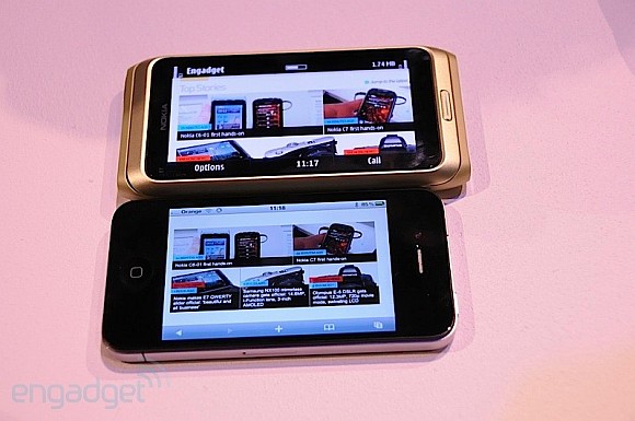 Nokia’s recently introduced C6, C7 and E7 comes with a Clear Black Display (CBD). The engadget team that was covering the Nokia World 2010 event managed to compare a prototype E7 against the iPhone 4.