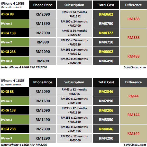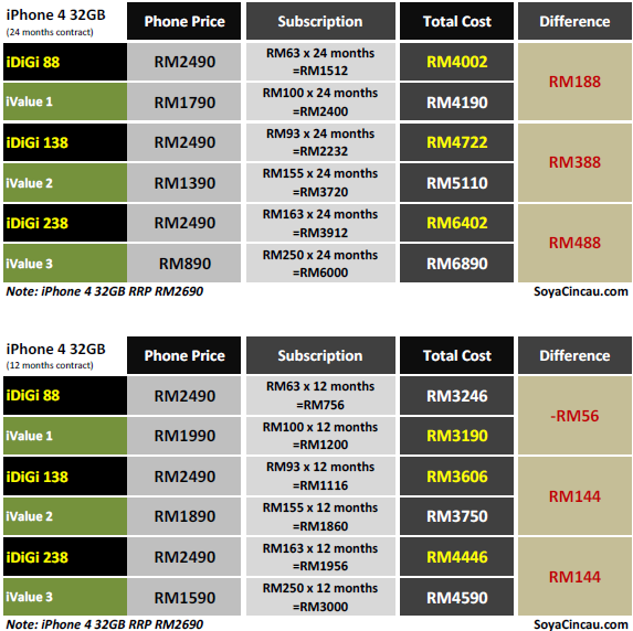 UPDATE: Added comparison for iPhone 4 32GB and 16GB for both 12/24 months contract. Please note that all DiGi’s iDiGi plans are tied to 24 months contract. The 12 months table below is for comparison only.
