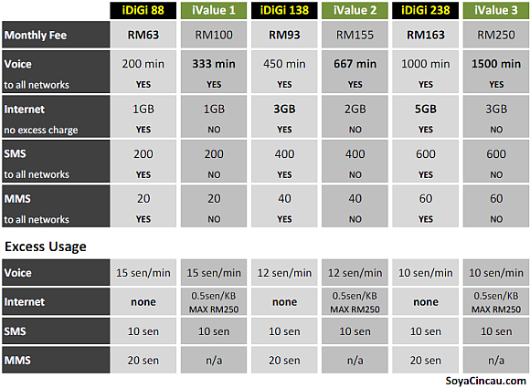 - Monthly subscription for iDiGi plans is RM3 more than before. Used to be RM60 for iDiGi 88, RM90 for iDiGi 138 and RM160 for iDiGi 238.