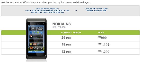 Maxis has finally revealed its Nokia N8 bundling on their site. It goes for as low as RM999 over 24 months data contract on top of existing Value Plan 50 plans and above. If 24 months is too long, there’s a 18 months and 12 months option that offers the device for RM1149 and RM1299 respectively. Maxis data plans starts from RM58/month for 500MB and up to RM88/month for 3GB quota.