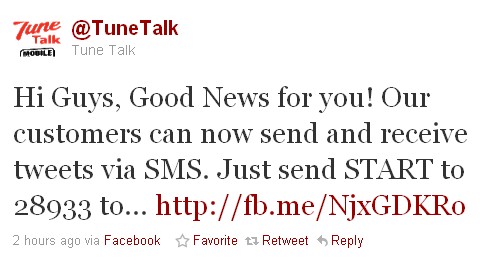 Tune Talk has announced via twitter that twitter SMS is now available on their network. This is similar to the twitter SMS service offered by DiGi and Maxis.