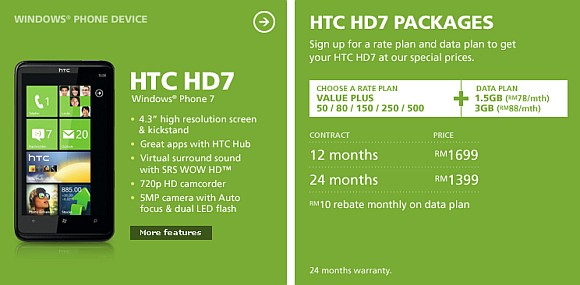 After several days since the launch of the HTC HD7, Maxis’s website finally showed its bundled pricing. It is offered from RM1399 for 24 months and RM1699 for 12 months contract with a 1.5GB or 3.0GB data plan.