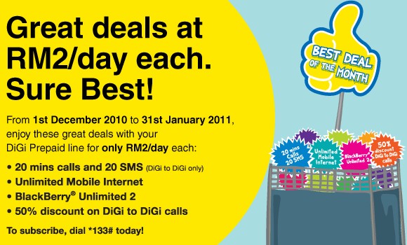 DiGi Prepaid is offering a special deal where you can either get cheap calls and SMS or unlimited internet for only RM2/day. This runs from 1st December 2010 until 31st January 2011. There are four RM2 daily deals on offer which can be activated with the respective codes below.