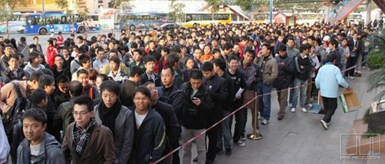 Unlike Apple’s usual limit of two or three purchases per customer at launch of a hot device, Miezu retailers set no such limit. All these people standing in line are allowed to but as many Meizu M9s as they like.