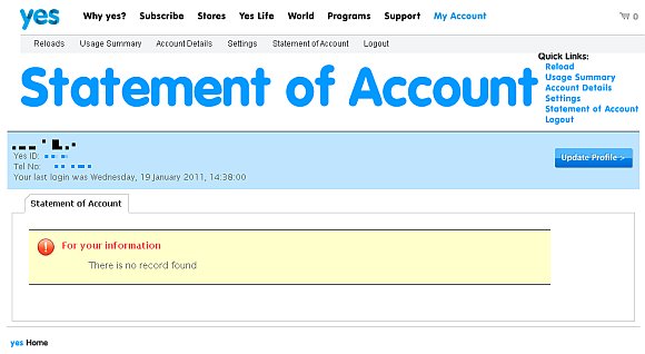 About a week ago, Yes had started offering its customers some usage info on Self Care which displays how much data, calls and SMS you’ve made so far. Now they’ve added a new feature called Statement of Account which should rightfully show you itemised details of your usage. Unfortunately at time of posting, it doesn’t show anything for our account. Most probably we might need to wait for our billing cycle in order for the statement to be generated.