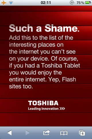 Yes, Toshiba is taking a stab at the iPad’s inability to render Flash websites. It’s a bit of gamble and a rather moot point if you ask us. The lack of Flash on iOS devices have been brought up so many times we’re not sure if anyone out there still cares. And by not having a version of the teaser site that’s viewable on the iPhone or iPad, Toshiba is shunning away some potential customers because let’s face, although peddling the Toshiba Tablet to an iPad owner might be pointless there are a number of iPhone owners out there who are looking for an iPad alternative. That’s a potential market for Toshiba. Anyway, what do we know.