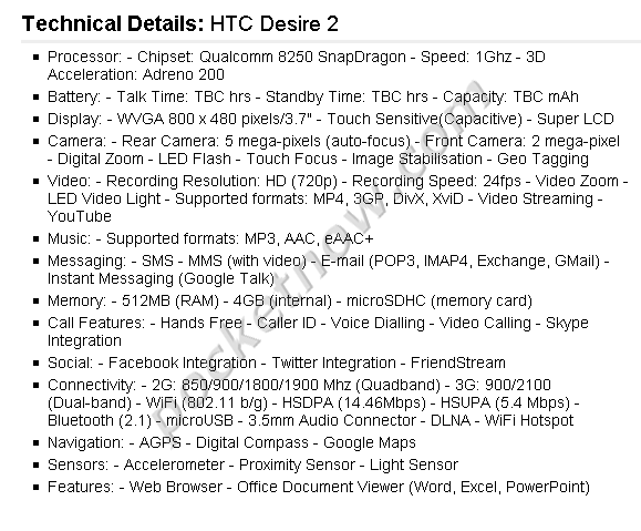 Next is the Desire 2. Disappointingly the new Desire will only get a next-gen single-core 1GHz Snapdragon processor with 512MB RAM and 4GB of on board storage space. Display wise, it is specced with a 3.7-inch (800×480) WVGA SLCD screen. There’s a 5MP rear camera with 720p video capabilities and a 2MP front camera.