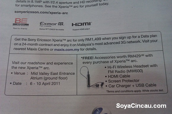 Today Sony Ericsson will be revealing the Xperia arc in Malaysia market with contract availability on Maxis. While we await for the event to start, the Sun had carried an ad which shows its official pricing of RM1499 with 24 months subscription of Maxis postpaid plan.