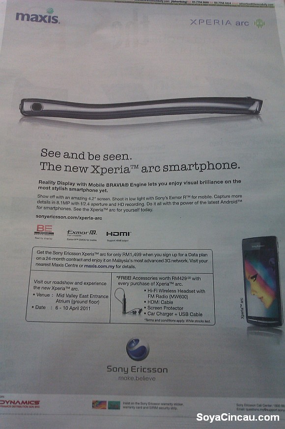Today Sony Ericsson will be revealing the Xperia arc in Malaysia market with contract availability on Maxis. While we await for the event to start, the Sun had carried an ad which shows its official pricing of RM1499 with 24 months subscription of Maxis postpaid plan.