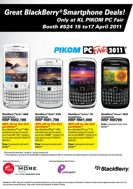 For the PC Fair this weekend, BlackBerry is offering a pretty good deal with 50% off the RRP on your second BlackBerry purchase. That’s right when you buy a BlackBerry device you’re entitled to purchase the second unit for only half of price. The catch is that the offer is limited to the first 30 customers/day (10 per device) and one offer per customer.