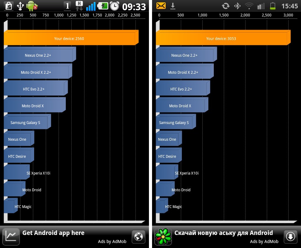 Scoring over 3,000 points in both tests, there’s no doubt that the Samsung Galaxy S II is blisteringly fast but the LG Optimus 2X is no slouch either considering it’s slower clock speed.