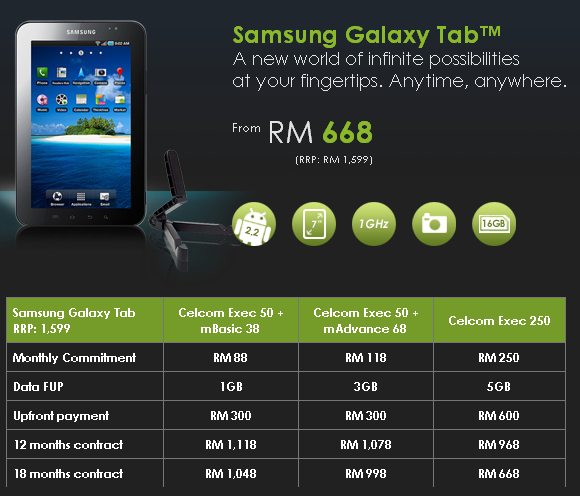 Surprisingly we also noticed from the site that Samsung Galaxy Tab is now offered at a much reduced price from only RM668 with 18 months contract of Celcom Exec 250. For those who wish to get something lower, the Galaxy Tab goes for RM1188 with Celcom Exec 50 + mBasic 38 which comes with 1GB of data at only RM88/month commitment. You can check this out over at Celcom’s new smartphone site.