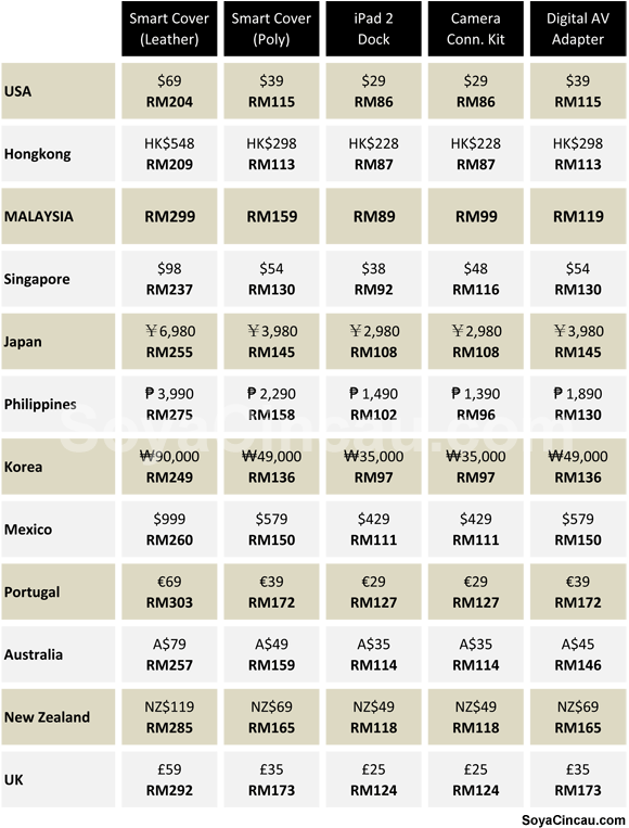 From our findings above, the Leather Smart Cover in Malaysia is among the most expensive of the bunch at RM299. As comparison, getting it from Hong Kong costs RM209 while Singapore at RM237. Fortunately not all accessories are expensive in Malaysia as the iPad 2 dock and Camera Connection Kit is much more reasonable below RM100. Even our poly smart cover is similarly priced as Australia.