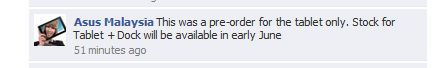 Also ASUS Malaysia has updated via Facebook that the all important keyboard dock is coming “early June” though details are still scarce. The update mentioned that stock of the dock will be sold together with the Eee Pad Transformer. There’s no mention of early-adopters being able to purchase the dock saperately and how much is it going to cost.