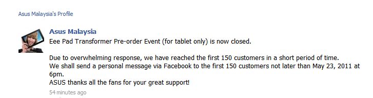 ASUS Malaysia has updated their Facebook page to confirm that all 150 pre-order units have been pre-ordered. This of course doesn’t mean that the pre-orders will translate to actual sales because those who have pre-ordered still have the option to opt out of the purchase.