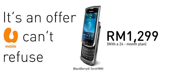 For the first 200 to take up this BlackBerry Torch offer, U Mobile is giving additional RM100 rebate and the first 50 will also get to enjoy extra accessories worth RM340.