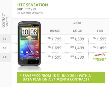 Maxis has made the HTC Sensation more affordable at only RM999 on contract. This 2 weeks promo from 18 – 31st July is tied with 24 months contract of 3GB data plan. The bare minimum commitment to take up this offer is RM108/month which consists of RM30 Value First postpaid with RM78 3GB data plan after RM10 rebate.