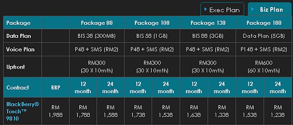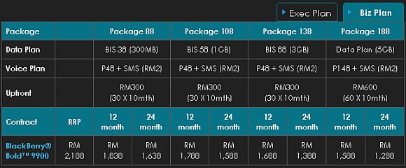 For the BlackBerry Bold 9900 which retails at RM2188 outright, goes for as low as RM1638 on Celcom Exec 50 + BIS Pro which gives you 5GB of data for add-on RM138/month. There’s only 1 contract duration available which is 12 months. For BIZ user, you get a choice of 12 months and 24 months contract which offers the Bold 9900 as low as RM1288 for 24 months contract of P148 + SMS with a 5GB data package.
