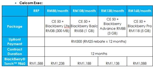 According to the standard plans, the Torch 9860 which is priced outright at RM1588 is offered from as low as RM588 with 24 months contract on Biz Package 188. For Celcom Exec plans, it is offered as low as RM1088 on Celcom Exec 50 + BlackBerry Pro (5GB) plan.