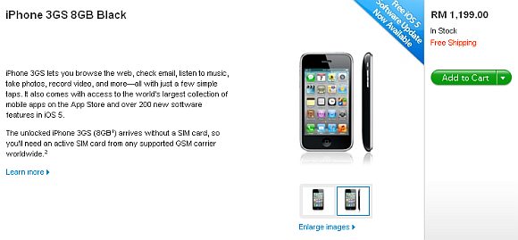 Apart from the iPhone 4 8GB which can be bought for RM1,799 outright, reader David had pointed out that Apple Store is also offering the iPhone 3GS 8GB for RM1,199 outright. This makes it cheaper and can be a choice for mid level smart phone buyers.