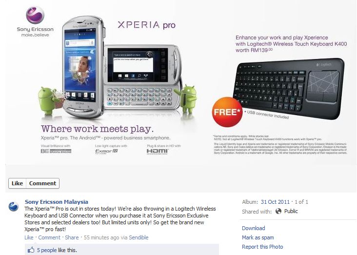 Sony Ericsson Malaysia via its Facebook fan page has announced the availability of the Xperia pro.