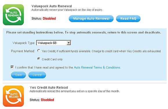 More information on credit auto reload & valuepack auto renewal at Yes website.