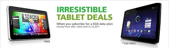 Maxis is throwing some time limited deals for the HTC Flyer and Motorola Xoom 3G tablets. With 24 months contract of Maxis 6GB Data Plan at RM98/month, the HTC Flyer can be yours for FREE while the Motorola Xoom 3G is offered at RM299.