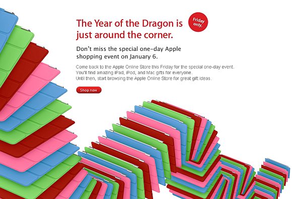 If you have been eyeing for Apple products, mark your calendars this Friday 6th January 2012. Apple Online store is throwing a one day Apple shopping event in conjunction with the upcoming Chinese New year festival.