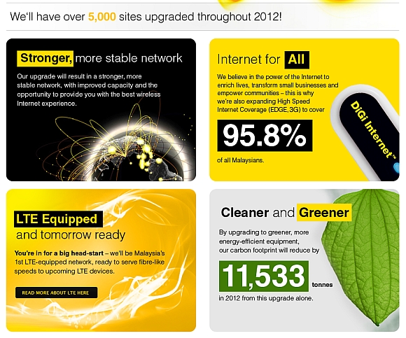 DiGi says its “Tomorrow Network” will be Malaysia’s first LTE-equipped network by the end of 2012. At the same time the upgraded network will also expand existing EDGE and 3G coverage to 95.8% of the Malaysian population. In addition, DiGi also promises a more stable and environmentally friendly network once the year round upgrade is completed.