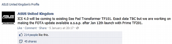 No firm date has been given but ASUS UK says that they are aiming to release the FOTA (Firmware Over-The-Air) update as soon as possible after the scheduled January 12 launch of the Transformer Prime in the UK.