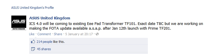 Just a short update. ASUS UK via its Facebook page has announced the Android 4.0 Ice Cream Sandwich will available for the first-gen Eee Pad Transformer. This is definitely good news for Transformer users in Malaysia as you can expect the update to arrive here as well.
