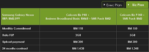For consumer plans, you get a choice from monthly RM88 to RM250 commitment plans with 12 months and 18 months contract options. The highest commitment plan of Celcom Exec 250 at 18 months will let you pick up a Galaxy Nexus for RM1,368 while the lowest and shortest commitment of Celcom Exec 50 + Mobile Internet Basic of 12 months will let you have it for RM1,708. On BIZ Plans, you’ll have 2 monthly plan options at RM118 and RM150 but tied to a 24 months duration.