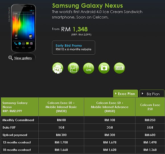 UPDATE: Celcom updates their Galaxy Nexus page, now offers early bird RM10 x 6 months promo discount. Now their Galaxy Nexus is showing 16GB instead of earlier 32GB. According to the T&C, the early bird promo is valid only for the first 300 subscribers.