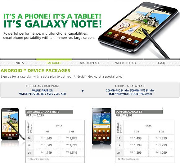 On Maxis, the 5.3″ HD Super AMOLED device is offered with either 1GB and 3GB bolt-on data plans on top of any Maxis Value postpaid subscription. You can choose from 3 contract duration options of 12, 18 and 24 months. The Galaxy Note is offered as low as RM1,549 with 24 months subscription of 3GB data plan. For the minimal spender, it goes for RM1,949 with 12 months subscription of 1GB data.