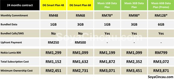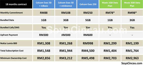 The 3 telcos have different ways of bundling the Lumia 800. On Celcom, there’s just 3 Celcom Exec plans which comes bundled with voice, sms & data. For DiGi, their SmartPlan comes with bundled data but calls and SMS are charged separately. As it is likely that you would actually make calls and SMS, the cost of ownership is more than what is listed here but we’re compared based on minimum cost alone.