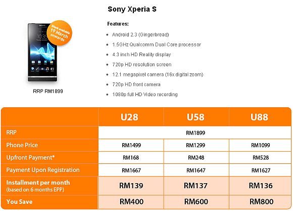 UPDATE: U Mobile updates the pricing table. Change on the upfront payment but Xperia S price remained the same.