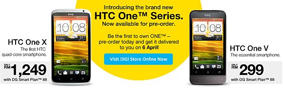 DiGi has started its pre-orders for the HTC One Series – the HTC One X & HTC One V. The HTC One X is offered as low as RM1,249 and the One V as low as RM299.