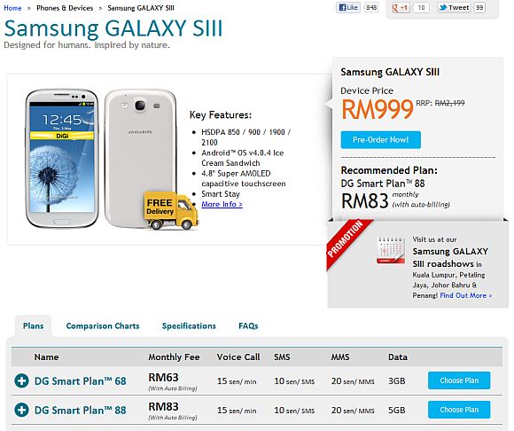 DiGi has started taking pre-orders for the Samsung Galaxy S III. The operator puts the recommended retail price of the device at RM2,199, slightly above our RM2,100 price prediction. The Galaxy S III is available from DiGi for as low as RM999 — as the earlier clues suggest — with a 24-months contract.
